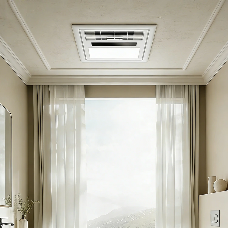 El diseño multifuncional todo en uno combina calefacción, ventilación, iluminación y soplado de aire. Ahorra espacio y costos, ofreciendo una solución completa y versátil para espacios de baño pequeños.